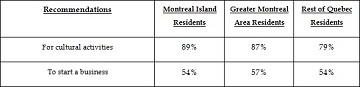 While most have a pessimistic outlook for Montreal looking into next year, this has not deterred most residents from recommending the city to others for cultural and entrepreneurial endeavours. The table below outlines how `likely' residents are to recommend Montreal for cultural activities and starting a business: