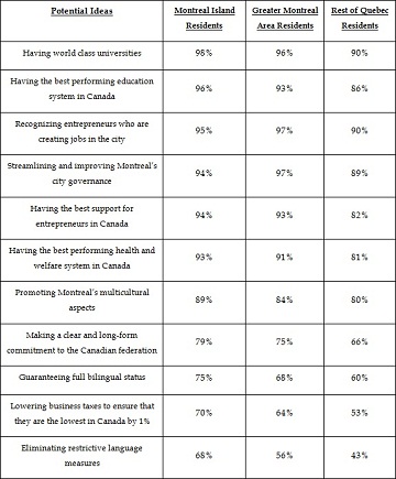 As perceptions of Montreal as a world class city wane, several ideas and strategy focuses have been discussed to make the city more attractive and bring it back its luster. Respondents gave higher ratings to ideas centered around making the city an attractive setting for both students and business leaders, as well as providing a more efficient and effective governance model. The table below outlines the ideas presented that could be used to help Montreal become more competitive and attract new business, as well as the proportion of region residents who indicate that these are `good' ideas: