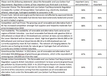 Prior to answering the survey questions, respondents to the survey were provided with the following information: "British Columbia has a regulation called the Renewable and Low Carbon Fuel Requirements Regulation. This Regulation enables the Province to set benchmarks for the amount of renewable fuel in B.C.'s transportation fuel blends and reduce the carbon intensity of transportation fuels overall. As a result of this Regulation, new renewable and alternative fuels are becoming more available, including renewable fuel blends with gasoline or diesel, in addition to new electric car charging stations and fueling terminals for natural gas or hydrogen."