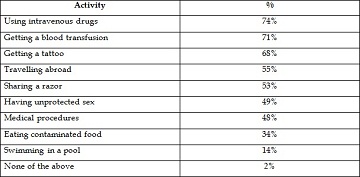 Canadians born between 1945 and 1975 think the three most risky activities for contracting hepatitis C are using intravenous drugs (74%), getting a blood transfusion (71%), and getting a tattoo (68%). The entire list is below: