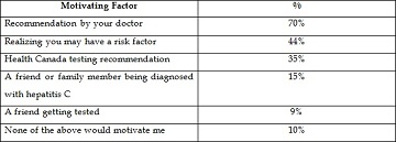 Canadians born between 1945 and 1975 report the most motivating factor to get tested or talk to their doctor about hepatitis C is a recommendation from their doctor (70%), followed by realizing they may have a risk factor (44%). The full list of responses is shown below: