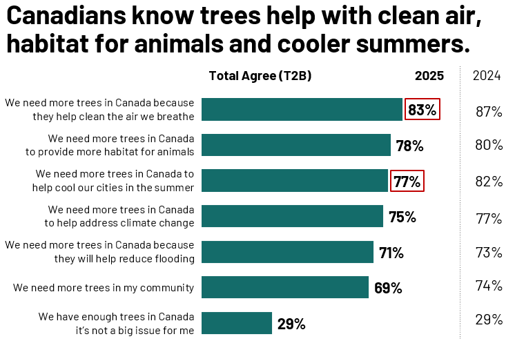 The value and role of trees is top of mind for Canadians with 83% (vs. 87% in 2024) agreeing Canada needs more trees because they help clean the air Canadians breathe. Canadians also recognize that trees provide habitat for animals (78% vs. 80% in 2024), help cool our cities (77% vs. 82% in 2024), help address climate change (75% vs. 77% in 2024) and help reduce flooding (71% vs. 73% in 2024).