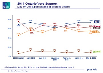These are some of the findings of an Ipsos Reid poll conducted between May 6 to 9, 2014, on behalf of CTV and CP24. For this survey, a sample of 821 Ontarians, from Ipsos' Canadian online panel was interviewed online. Weighting was then employed to balance demographics to ensure that the sample's composition reflects that of the adult population according to Census data and to provide results intended to approximate the sample universe. The precision of Ipsos online polls is measured using a credibility interval. In this case, the poll is accurate to within +/-3.9 percentage points had all adults in Ontario been surveyed.