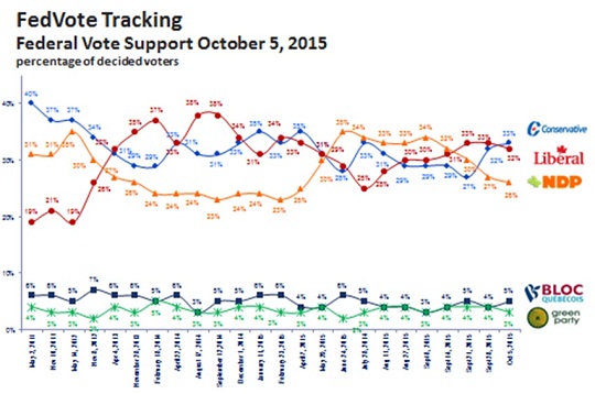 These are some of the findings of an Ipsos poll conducted between October 2 to 5, 2015 on behalf of Global News. For this survey, a sample of 1,441 Canadians eligible to vote was interviewed online via the Ipsos I-Say Panel (comprising ~150,000 panelists) and non-panel sources (river sampling). Given Ipsos' use of river sampling and a router to match respondents who may not qualify for other surveys with one they do qualify for (such as this poll), it is not possible to identify the number of respondents invited to participate in the survey, or a traditional measure of response rate. Weighting by region, age, gender and political variables was employed to balance demographics to ensure that the sample's composition reflects that of the adult population according to Census data and to provide results intended to approximate the sample universe. The precision of Ipsos online polls is measured using a credibility interval. In this case, the poll is accurate to within +/ - 2.9 percentage points, 19 times out of 20, had all eligible voters been polled. The credibility interval will be wider among subsets of the population. All sample surveys and polls may be subject to other sources of error, including, but not limited to coverage error, and measurement error.