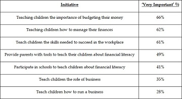 - Four in ten (44%) of those without children believe volunteer participation in schools to teach about financial literacy is `very important', while one-third (35%) of parents feel the same way.