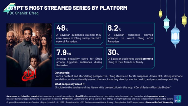 Success during Ramadan is about conversion at every stage. The strongest series are not only widely known, but are able to turn awareness into viewing, and viewing into conversation and recommendation. Titles such as Efrag, Ein Sehreya, Sohab El Ard, and Fakhr Al Delta illustrate this dynamic, combining strong visibility with high engagement and positive audience perception.