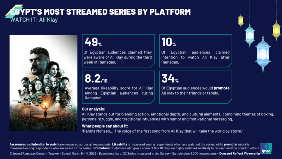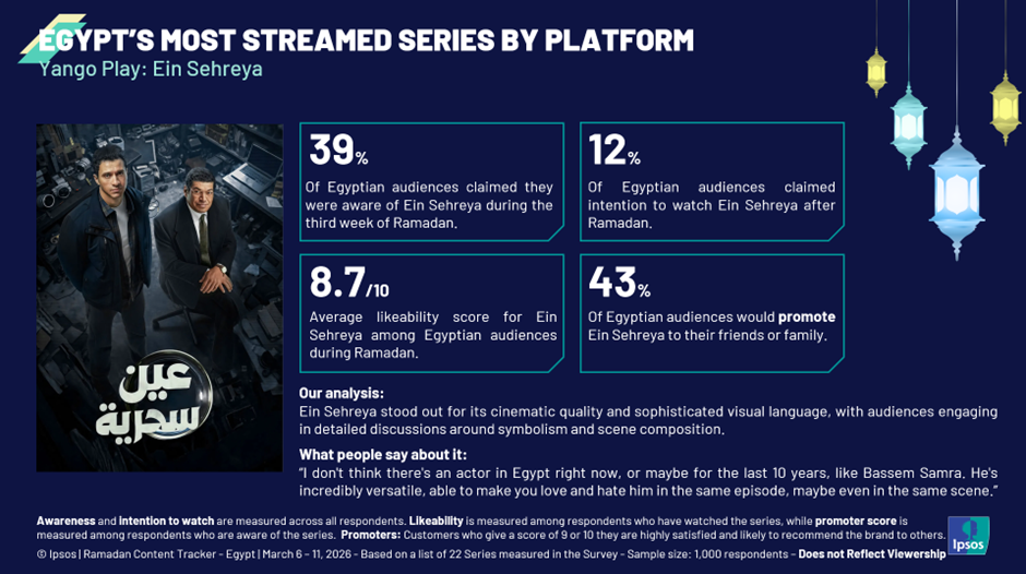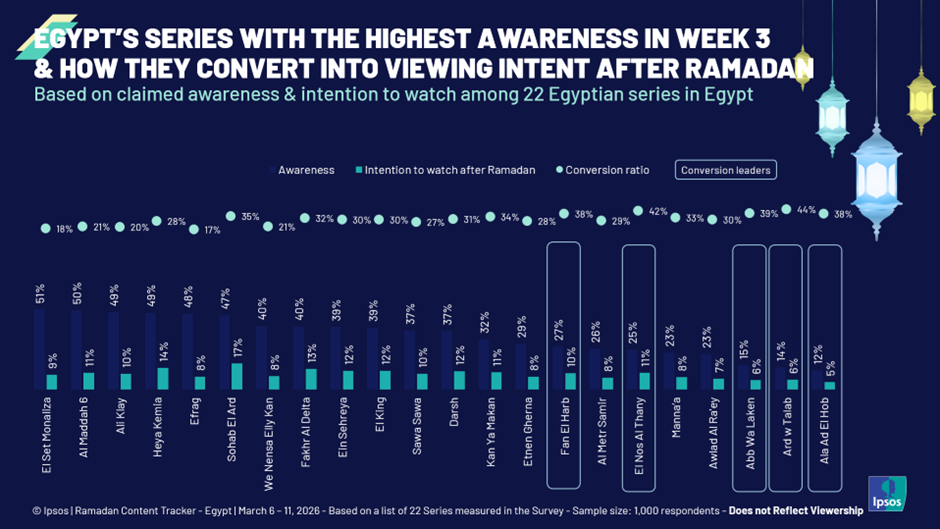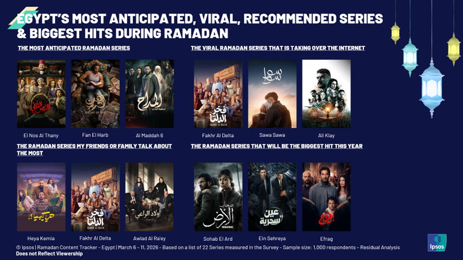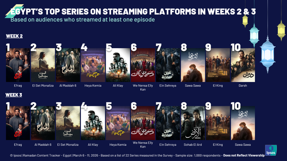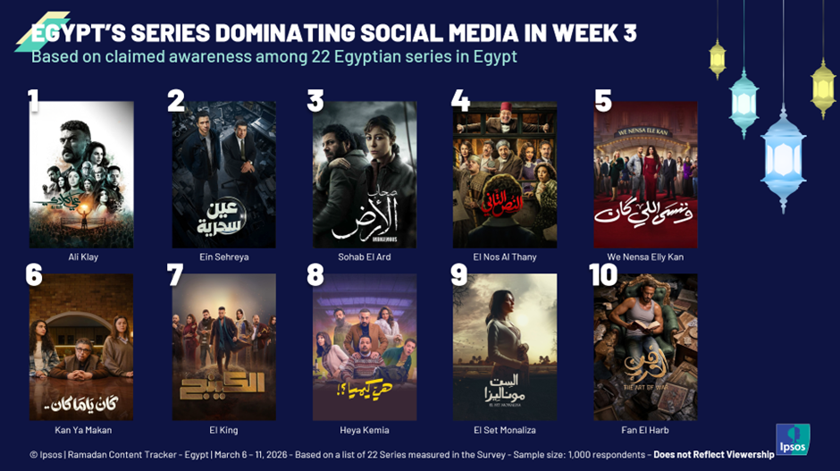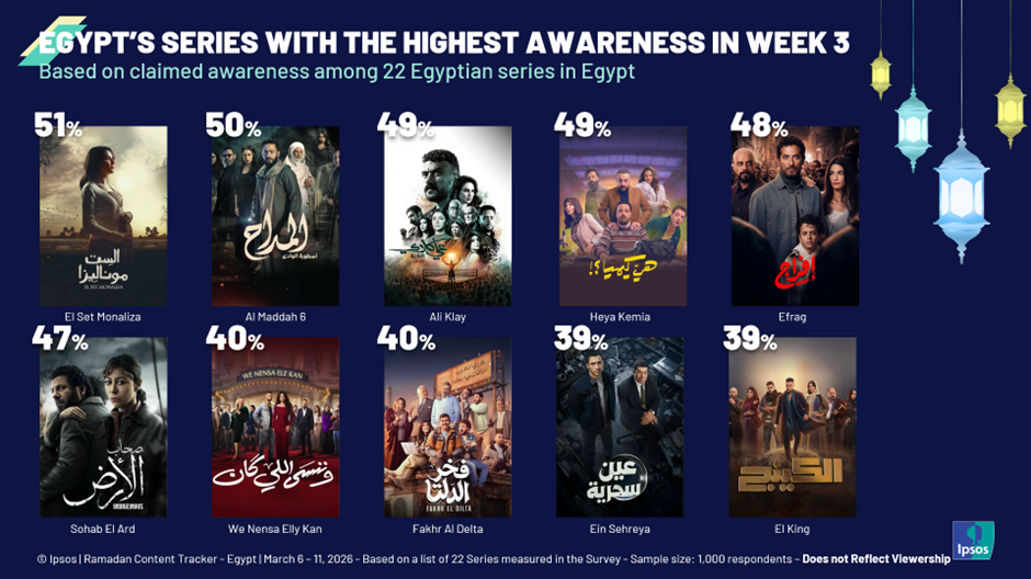 Our Ipsos report presents an integrated analysis of social intelligence insights and online survey data from the first three weeks of Ramadan 2026. Each week, we collected 1,000 respondents in Egypt and covered 22 Ramadan series selected by experts across platforms. We measured key metrics such as awareness, anticipation, and intention to watch or stream.