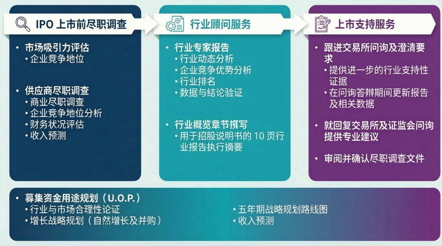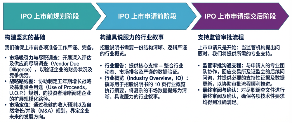 无论是在促成并购重组,还是协助企业推进上市流程,我们确保每一项战略举措均以严谨的独立市场研究(IMR)为支撑,以实现交易价值最大化并满足监管审批要求。我们不仅规划战略增长 -- 更提供可执行的市场洞见,将战略意图转化为资本市场的成功成果。