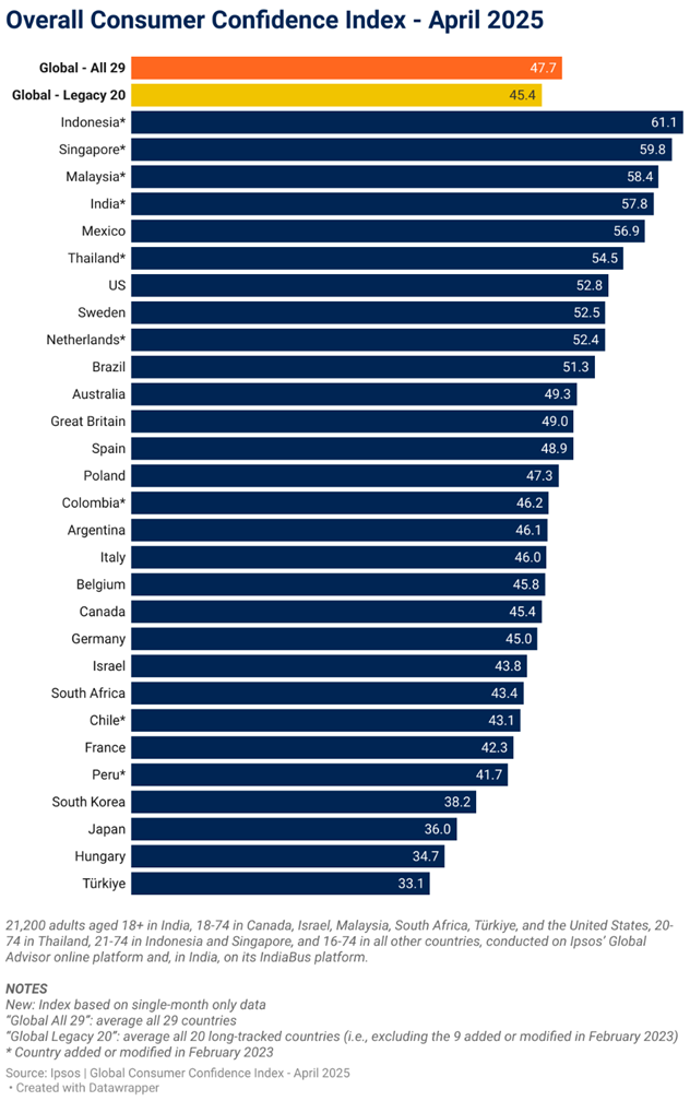 The Global Consumer Confidence Index is the average of all surveyed countries’ Overall or “National” indices. This month’s installment is based on a monthly survey of more than 21,000 adults under the age of 75 from 29 countries conducted on Ipsos’ Global Advisor online platform. This survey was fielded between March 21 and April 4, 2025.