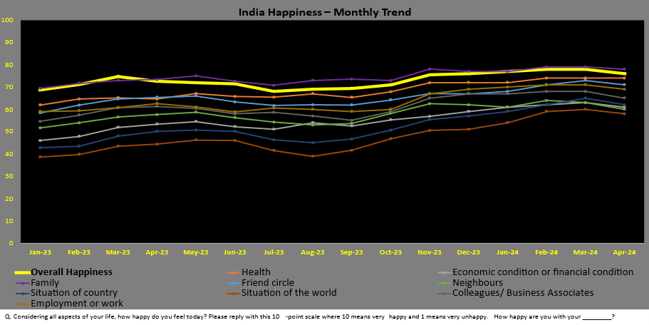The survey further delved deeper into the different areas of citizens to gauge their happiness levels. Notably, happiness was seen more around personal relationships, wellbeing, livelihood and social ecosystem. In April, citizens polled said they are happiest about family (78%), health (74%), friends’ circle (71%), employment or work (69%), colleagues/ business partners (65%), situation of the country (62%), economic/ financial conditions (61%), neighbours (60%) and situation of the world (58%).