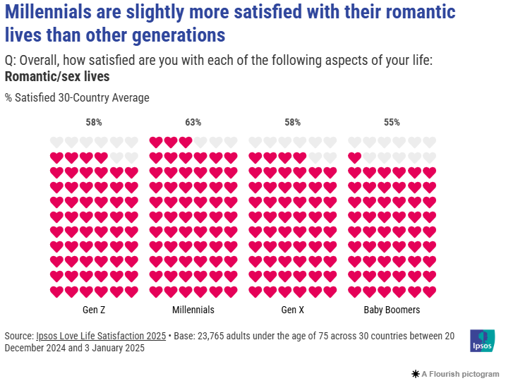 Millennials, those aged in their 30s and early 40s are happier with their romantic and sex lives than other generations. 63% of Millennials are satisfied with this part of their lives compared to 58% of Gen and Gen X and 55% of Baby Boomers.