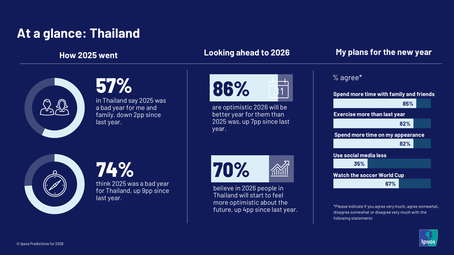 The Ipsos Predictions 2026 report provides a summary of Thai public opinion regarding the previous year, expectations for 2026, and personal resolutions. The data reveals a decisive shift in public mood, with high personal hopes now paired with an increased belief in a more optimistic national future. This surge in optimism comes alongside strong commitments to personal health and well-being in the new year.