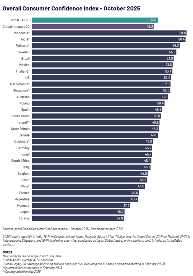 Data from the Global Consumer Confidence Index (Oct 2025) shows Asia-Pacific moving in three directions at once. Indonesia and South Korea are surging ahead, while Thailand and Malaysia are consolidating, and Japan and Australia are softening. The region looks steady on paper, but sentiment is clearly split between confident in recovery, cautious in its staying power.