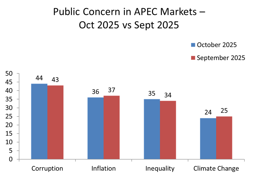 Concerns around corruption and inequality have increased. In Indonesia, corruption is cited by 68% and inequality by a record 53%, up seven points year-on-year. In Malaysia, corruption remains high at 54%, signaling persistent frustration with governance despite improving economic indicators.