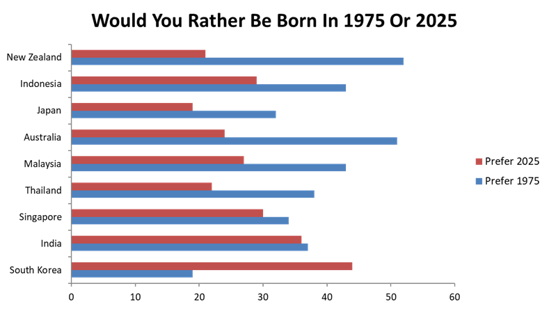 Most APEC countries lean nostalgic, preferring 1975 as a better time to be born. South Korea and India are the exceptions, with more respondents choosing 2025 — reflecting lived transformation and forward-looking optimism.