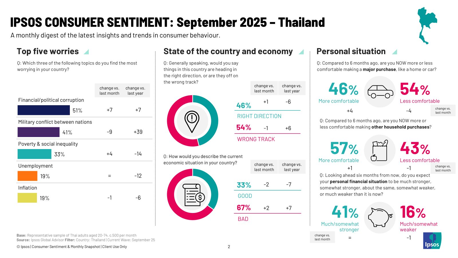 A significant shift in public sentiment has occurred in Thailand, as the public's primary concerns return to domestic issues. According to the September 2025 edition of Ipsos' What Worries the World global survey, worry about financial/political corruption is now back as the top concern, with 51% of Thais citing it as one of their most worrying topics. This marks a return to the long-standing trend of domestic issues dominating the national conversation.