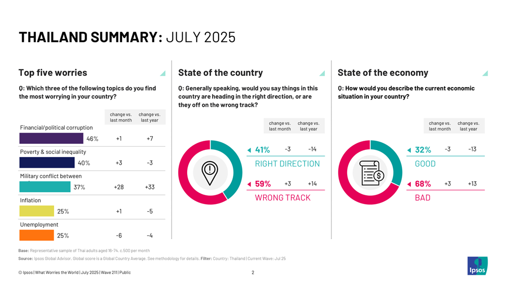The latest Ipsos What Worries the World survey for July 2025 reveals a significant shift in the anxieties of the Thai population, with "military conflict between nations" emerging as a rapidly escalating concern. This is alongside a continued pessimistic outlook on the nation's direction and economic health, according to the global survey conducted across 30 countries.