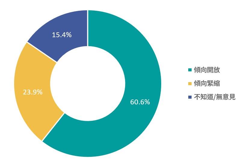 就整體兩岸政策而言,60.6% 的民眾傾向政府應該對中國大陸採取開放的立場,23.9% 傾向緊縮(圖5)。其中政黨傾向泛藍和台灣民眾黨的民眾傾向開放的比例(93.2%、89.2%)較高;而政黨傾向泛綠的民眾傾向緊縮的比例(51.5%) 較高(圖 6)。