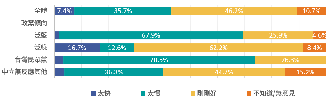 對於目前兩岸交流的速度是太快、太慢、還是剛剛好方面,46.2% 的民眾覺得目前兩岸交流的速度是剛剛好,35.7% 覺得太慢,7.4% 覺得太快(圖8)。其中政黨傾向泛綠的民眾認為交流的速度剛剛好的比例(62.2%)較高;政黨傾向泛藍和台灣民眾黨的民眾認為交流速度太慢的比例(67.9%、70.5%) 較高 (圖9)。
