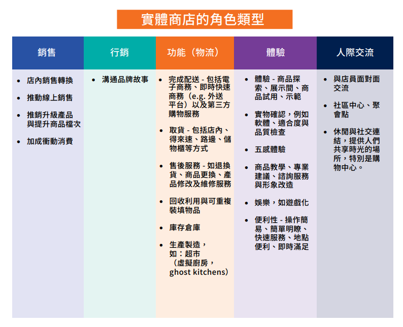 從零售商或品牌的觀點來看,實體店面不僅達成銷售目標,也滿足行銷的需求。然而,從消費者的立場來看,實體店面則提供了如下表所列的多種功能,像是體驗以及人性化服務。