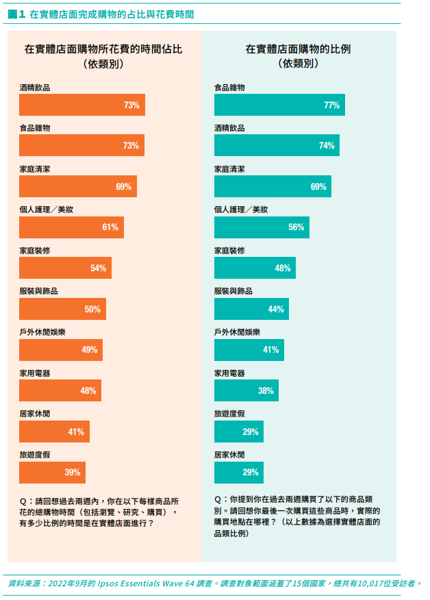 雖然疫情讓電商蓬勃發展,但隨著疫情緩和,人們逐漸重返實體店面購物。 根據益普索的數據,消費者在實體店內的購物時間(包含瀏覽、研究、購買)占其總購物時間的 39% 到 73%,此比例會根據商品種類而有所不同。在實體店內完成的消費比例介於 29% 至 77%,這個數字實際上在 2022 年 1 月至 9 月間有所增長。