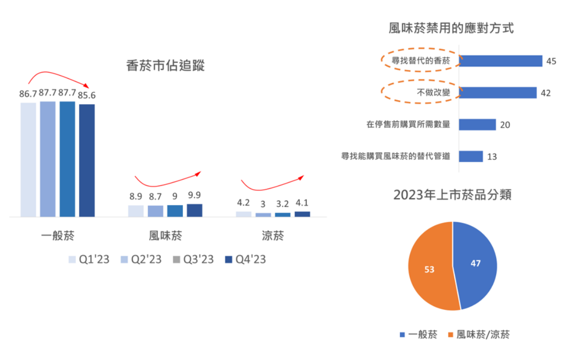 另一方面,統計 2023 年上市的新品中。過半是屬於風味菸/涼菸,顯見香菸業者尚未受到法規影 響而停止風味菸的上市,也仍持續研發在符合規範下的風味,以期未來能提供吸菸者傳統菸草味以外的選項。