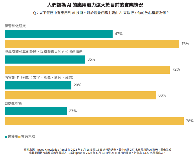 Z世代和年輕的千禧世代在眾多應用場景中更傾向於使用 AI 技術,並對 AI 生成的文本作品持信任態度。2023 年益普索的一項研究指出,在美國有70%之35至54歲的人認為職場中應用 AI 能夠節省時間與資源,而在18至34歲的年輕人中這一比例為67%;相較之下,在55歲及以上的區段中,這一比例則為53%。