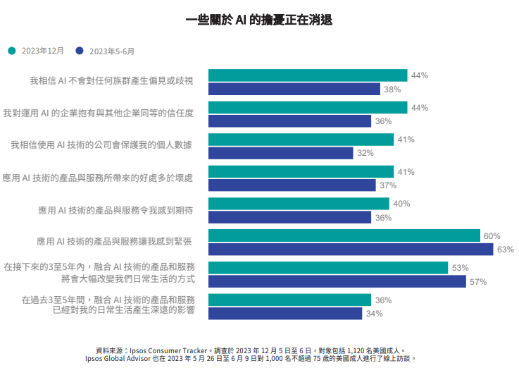 即便大眾對於 AI 的擔憂依然存在,且預計這種擔憂在未來數年仍會持續,但在2023年,他們對 AI 功能的潛力展現出了遞增的樂觀態度:根據益普索在2023年6月和12月進行的兩次調查相比,12月的結果顯示人們對運用 AI 的品牌更加信任,對運用 AI 技術的產品與服務持有更正面的看法。