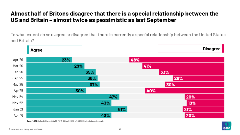 •    Almost half (48%) of Britons disagree that there is currently a special relationship between the US and Britain, up 7ppts since March, 15ppts from January.