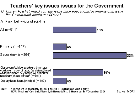 The large-scale MORI Teachers' Omnibus survey reveals school funding (16%), workload (16%) and pupil behaviour (13%) to be the Top 3 spontaneously identified issues for education professionals. Teachers working in the secondary sector, and 'at the chalkface', are much more likely than primary school colleagues or more senior staff to highlight pupil behaviour as their predominant concern: