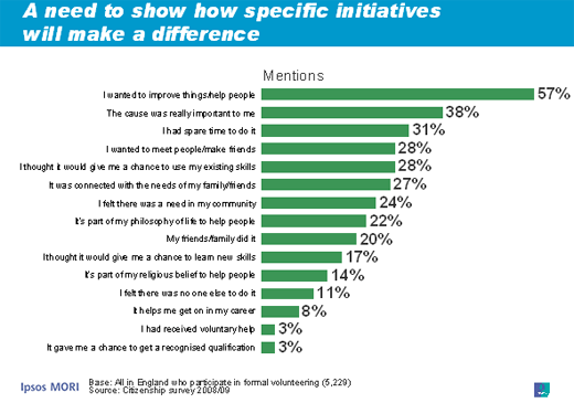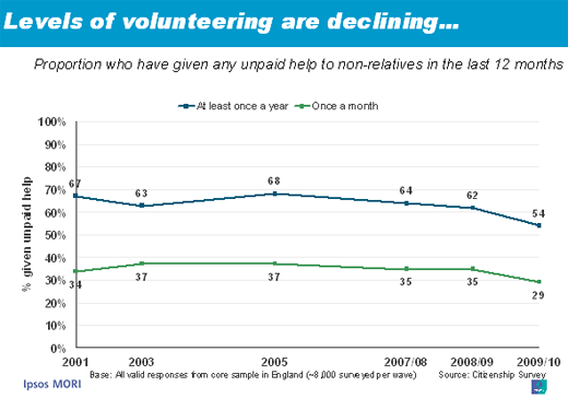 The Council had launched its Co-operative White Paper back in May 2010, setting out its view as to how local public services can be improved, whilst making necessary and unavoidable financial savings. The Paper set out a number of proposals for how the council could use different approaches to public service delivery (e.g. co-operatives, mutuals, social enterprise, and co-production). They also had set up a Co-operative Council Commission to enable citizen, elected member and expert involvement in the development of the new approach to delivering public services in Lambeth. The launch saw the culmination of many months of work and citizen consultation, on how the council proposes to work with the local community to bring about positive change. Unquestionably, it does sound great in theory, with public service providers and the local community pulling together, in harsh times, for the good of everyone - re-shaping services, and reducing the inequality divide – making government work or work better. The challenge of course is how to make something rather abstract for many local people, flourish, and become a reality. It will not be straight-forward. Tessa Jowell, keynote speaker at the launch spoke of councils needing to be risk aware, rather than being risk adverse, surrendering certainty, and to a degree, control. However, we know from our research that the questions that many people will ask is where the checks and balances are, and who will be held accountable if it goes wrong? This is especially important, given that the co-operative ideology is meant to encompass a vast range of services, reaching out to all citizens regardless of background. Ipsos has carried out research on behalf of the 2020 Public Services Trust at the RSA focussing on what politicians should take into account in their conversations with voters about reforms to public services. You will find a summary of the findings on our website. This leads me on to an important point - what will success look like, and how will it be measured? This is not an easy one to gauge, and in truth, nobody can really tell at this stage. The proof will be in the pudding, but it might take a long time for the pudding to bake. Some people may well wonder where the "fiscal stimulus" and continued momentum might come from, particularly if co-operative council doesn't work as well as it might be expected to, over the medium to long-term. The danger, as in the past (and we can learn a lot from history to make the future better), is if funding or resources are pulled too early. This was indeed the argument echoed by the commissioners.One of the guest speakers at the launch, Lord Victor Adebowale, Chief Executive of Turning Point argued that co-operative council would have happened anyway, even without the recession and tough budget cuts in the local government/public sector. However, cynics will say that it is only happening as the council is strapped for cash, and has little choice but to change. It is without doubt that we've faced the worst economic recession and downturn in a generation, with significant cuts across the public sector, and in local government in particular. The key challenge will be getting the local community on board and to be involved (over and above what happens already). But, as you can see from the following chart, levels of volunteering across Britain have been falling.