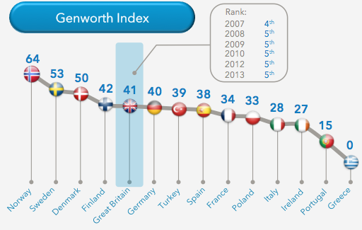 - But despite all of this, Britain continues to enjoy a higher Genworth Index score than most countries in Europe – which reflects the relatively high level of vulnerable households in the region overall