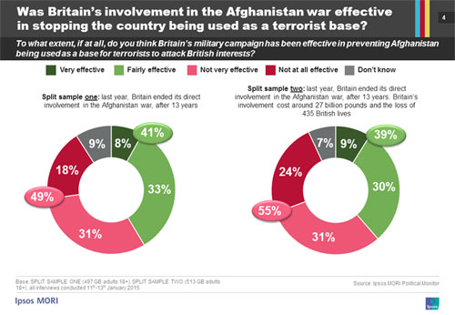 - Over half of those reminded of the cost (55%) thought the Afghanistan war was ineffective in preventing Afghanistan being used as a base for terrorists to attack British interests, compared with 49% of those not reminded. Four in ten each of those reminded (39%) and not reminded (41%) thought it had been effective at doing so