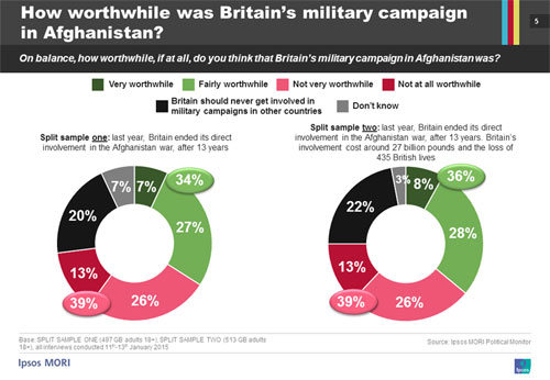 - Around a third felt the campaign was worthwhile, while four in ten felt it was not worthwhile. A fifth said Britain should never get involved in military campaigns in other countries. There was little difference whether people were reminded of the cost or not.
