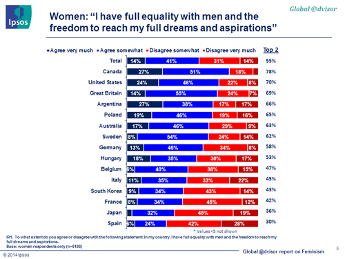 On the other side of the Channel, French women have a rather different perspective. Just 42% feel they have full equality, with only Japan and Spain recording lower scores (36% and 30% respectively).