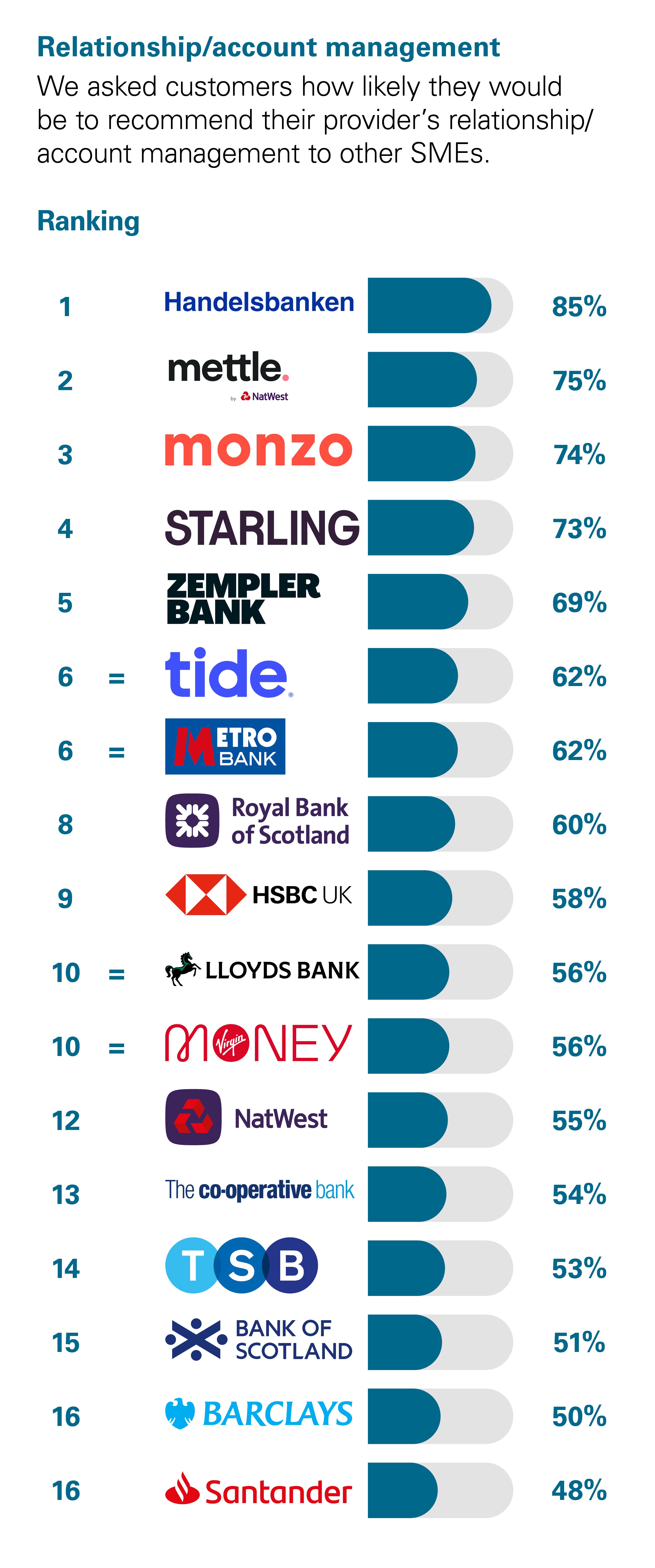 These results are from an independent survey carried out between January and December 2025 by BVA BDRC (now part of Ipsos) as part of a regulatory requirement, and we have published this information at the request of the providers and the Competition and Markets Authority so you can compare the quality of service from business current account providers. In providing this information, we are not giving you any advice or making any recommendation to you.