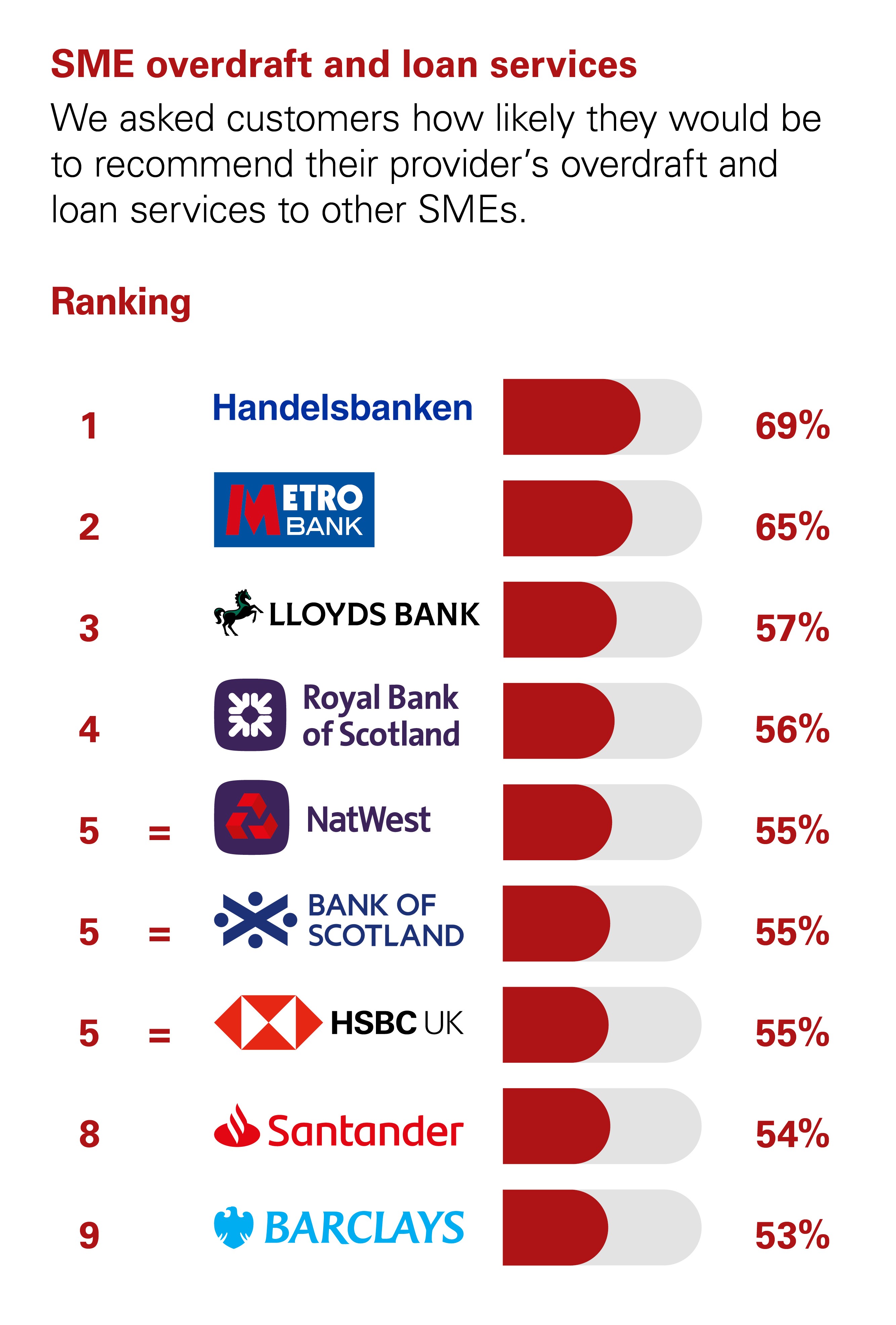 SME customers with business current accounts were asked how likely they would be to recommend their provider, their provider’s online and mobile banking services, services in branches and business centres, SME overdraft and loan services and relationship/account management services to other SMEs. The results show the proportion of customers of each provider, among those who took part in the survey, who said they were ‘extremely likely’ or ‘very likely’ to recommend each service.