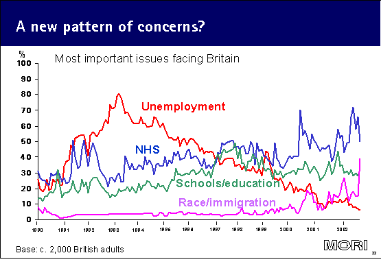 This is a remarkable rise in concern over the past few years (see chart below) which cannot be ignored, even if it is an uncomfortable trend. It also cannot be dismissed as the result of media hype -- but equally it is important to realise that people do have an enormously inflated view of the scale of the issue. As a nation we think 23% of the British population are first-generation immigrants, when in fact the figure is 6%.