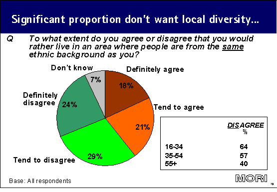 This is higher than we might have expected, particularly given the sensitivity of the question. But of course, it will often not be directly about ethnicity or race, but will be a shorthand for wanting to live in areas where people share your values -- something that 85 per cent of people say they want. For some people the idea of ethnic diversity will simply conjure up negative images of deprived, inner city areas.