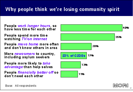 Supporters of diversity can draw some comfort from the survey. In particular, when asked about why there is less community spirit in Britain today (and then asked to choose one or two from six reasons) 40 per cent of people selected people working longer hours, 35 per cent selected people spending more time watching television or on the internet, 20 per cent selected people moving home more often and only in fourth place, with 17 per cent, came "there are more newcomers to the country, including immigrants and asylum seekers."