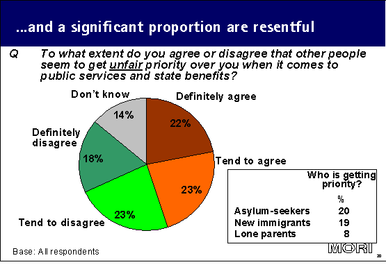 But in any case, it seems that many people's concern about ethnic diversity is often largely a part of a broader anxiety about other people free-riding. When asked in the MORI/Prospect poll whether other people get unfair priority when it comes to public services and state benefits 45% agreed that they did. This rises to over half among lower social classes, who will have most contact with these services and benefits, and, in a sense, most to lose.