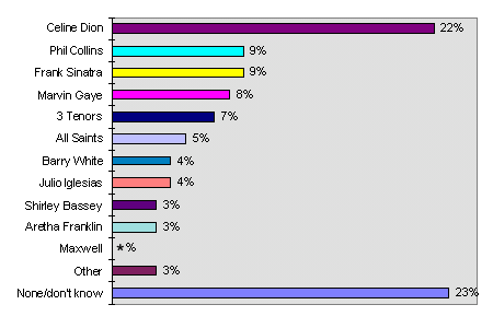 Music really is the food of love and while Dion may be the dish of the day, Phil Collins and Frank Sinatra are both on the menu. Each achieved nine per cent of Britons' votes.