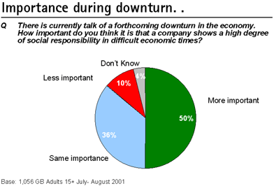 By a margin of 5:1, the British public believe that it is more important that companies should show a high degree of responsibility in difficult economic times, according to MORI's annual general public survey on Corporate Social Responsibility.
