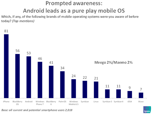 Ipsos’s Mobile Operating System Syndicated Study has found that the majority of current and potential smartphone users are aware of Android. Just over half (53%) say they have heard of Android when prompted with a list of brands of mobile operating systems (OS). But levels of awareness of Apple’s iOS4 (9%) are far lower than the iPhone (81%).