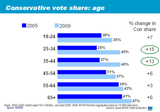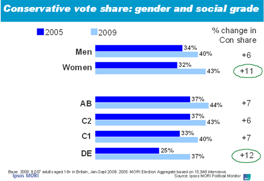 Since 2005, the Conservative Party's share of voting intention among the public as a whole has increased by eight percentage points. However, while the Conservatives have made gains across the board, Ipsos's analysis shows that they have made some of their best inroads among groups where their support was relatively low in 2005. In particular, their support has grown among 25-44 year olds, DE social grades and in the North of England. Their support has also increased more among women than men, and in the South West and West Midlands.