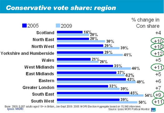 In nearly all cases, this has primarily been at the expense of Labour, with the exception of the South West where support has been gained from the Liberal Democrats.