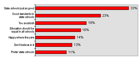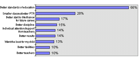 Those who would use independent schools cite higher education standards as the main reason for their preference (66%), with smaller classes, better life chances, better discipline, more teacher support, and better results also being cited by significant numbers of parents.