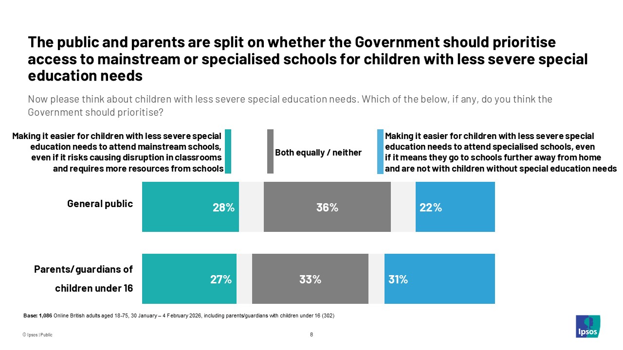 - Mainstream or specialist schools: The public and parents are split on whether the Government should prioritise access to mainstream or specialised schools for children with less severe special education needs. 27% of parents and 28% of the public prioritise making it easier for children with less severe special education needs to attend mainstream schools, even if it risks causing disruption in classrooms and requires more resources from schools. Conversely, parents (31%) are slightly more likely than the public (22%) to favour making it easier for children with less severe special education needs to attend specialised schools, even if it means they go to schools further away from home and are not with children without special education needs.