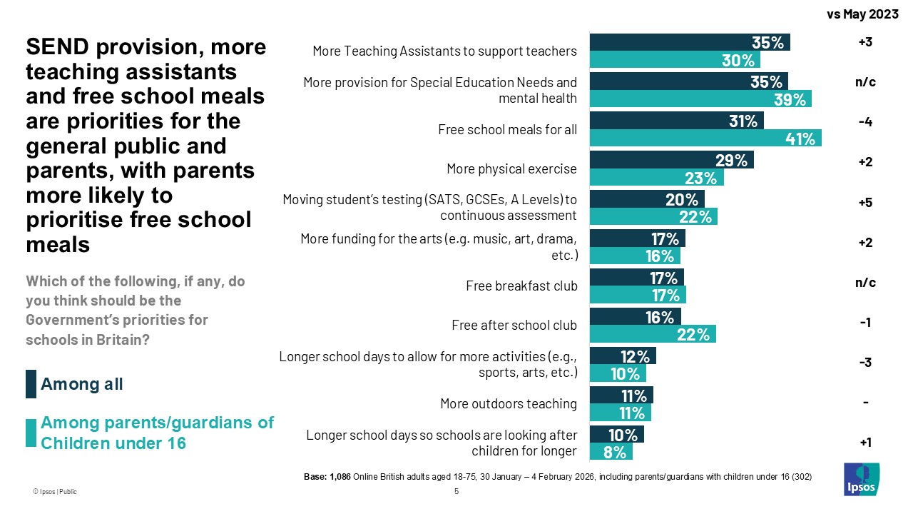 - What should be prioritised for schools: SEND provision, more teaching assistants and free school meals are priorities for both the general public and parents, with parents more likely to prioritise free school meals (31% of the public overall vs 41% of parents).