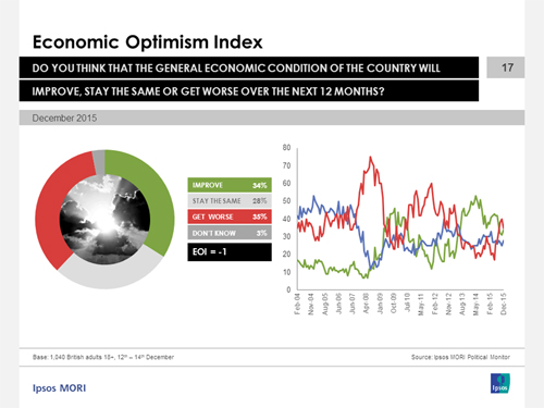 Economic optimism has slightly improved from November following George Osborne’s Autumn Statement announcement. One in three (34%) believe the economy will improve over the next 12 months (up three points) while 35% believe it will get worse (down five points), giving an Ipsos Economic Optimism Index of -1.